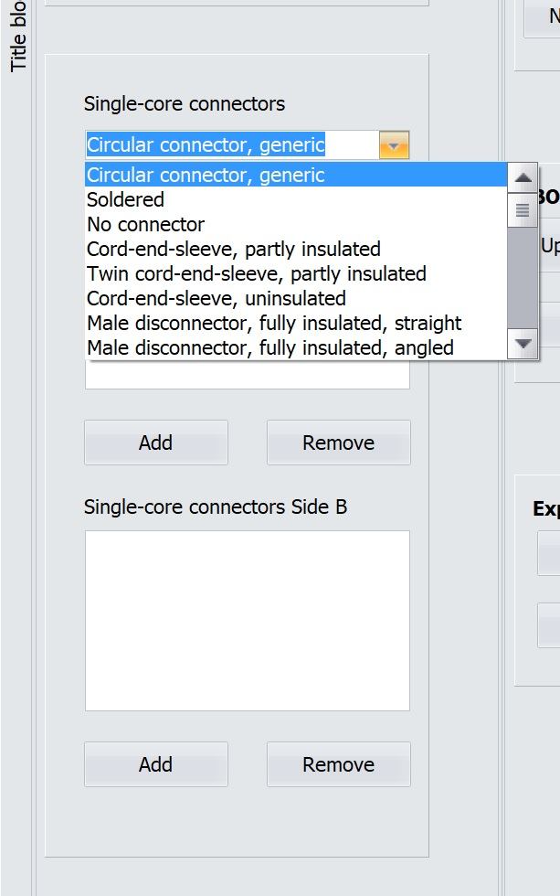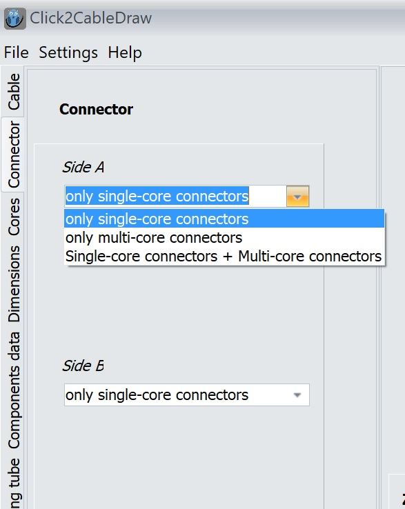 Click2CableDraw distinguishes between single-core connectors (SCC) and multi-core connectors (MCC). Single-core connectors are designed to be attached to a single core, while multi-core connectors can