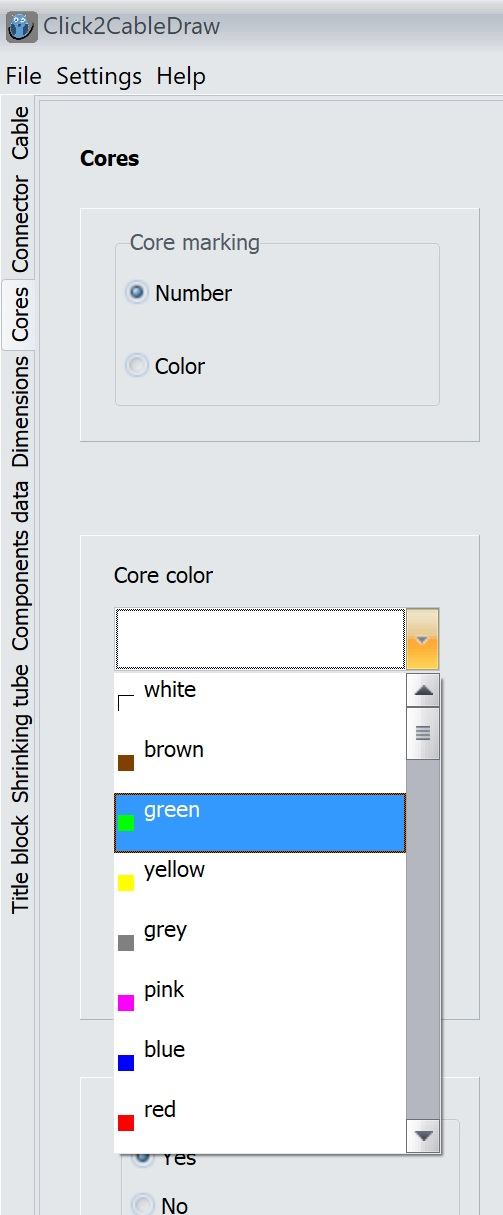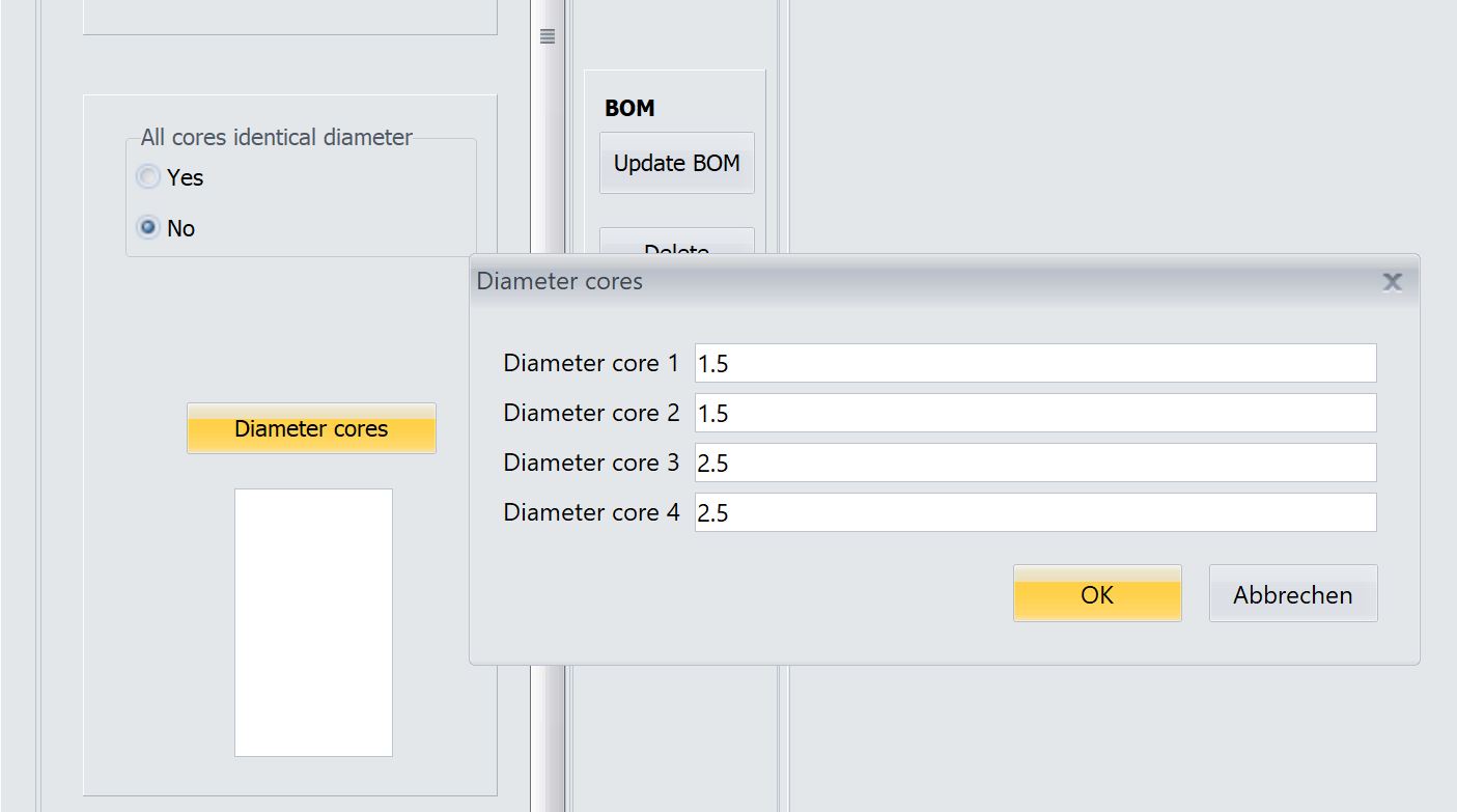 If this is not the case, tick No and then click on Diameter cores. You can now enter the cross-section of each individual core in