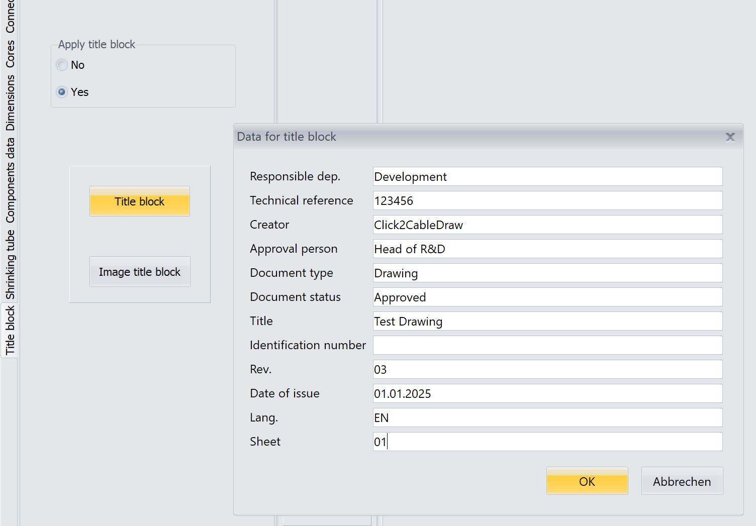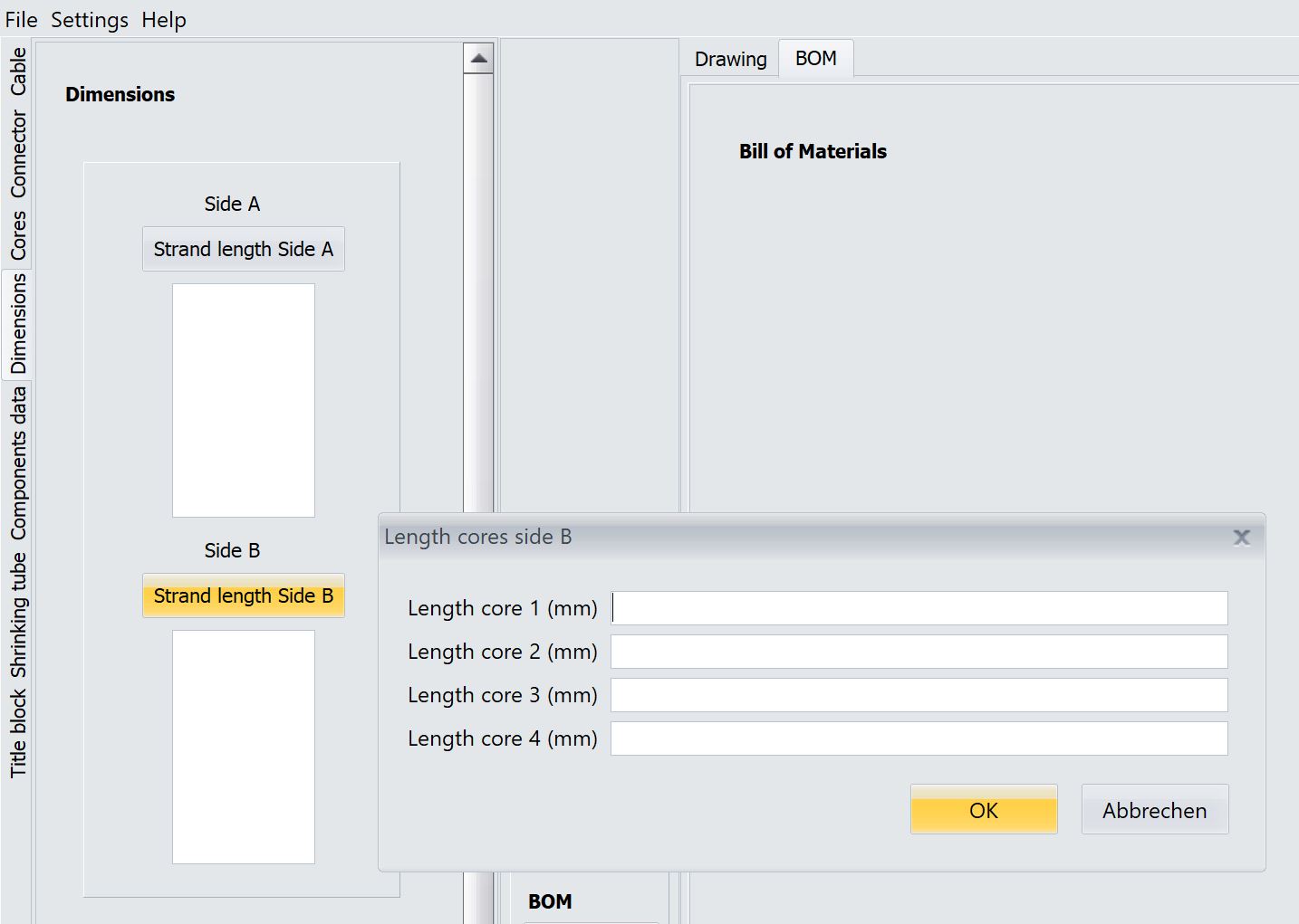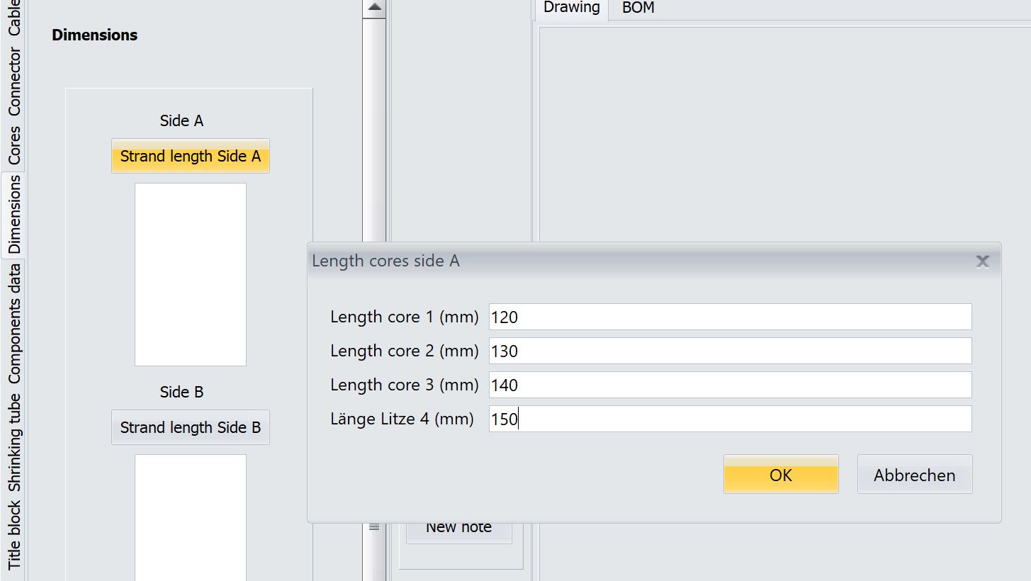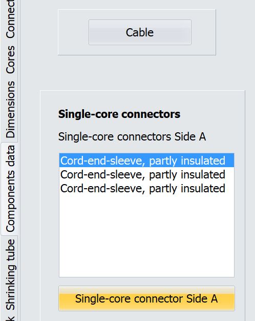Click on the Shrinking tube tab -> Apply Yes for Shrinking tube cable / cores -> Decide whether the shrinking tube for the cable / cores is the same or whether different shrinking tubes are used and then click on the Data... button.