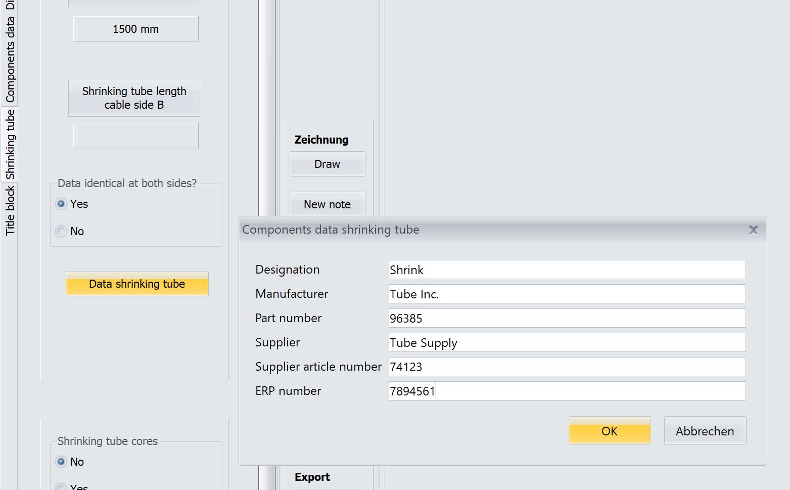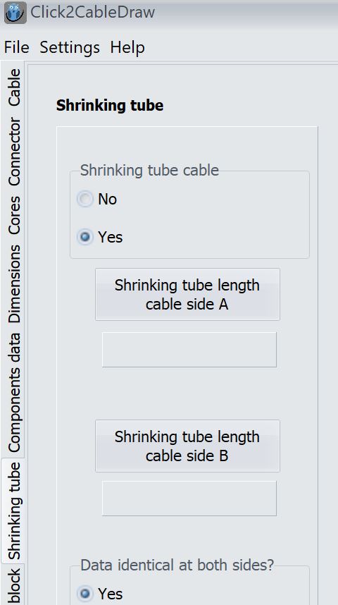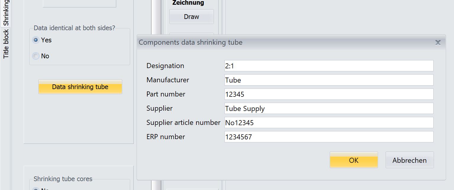 Further down, you can enter the component data for the shrinking tubes. If only one shrinking tube is used, select Yes in field Data identical at both sides. Now click on Data shrinking tube - you can now enter all the data for the shrink tubing in the window that opens.